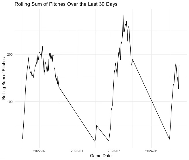The graph below is a rolling sum of pitches thrown over 30 day periods. Even with the multi-inning appearances, Muñoz is nowhere near the workload he was at in 2023, or even 2022.
