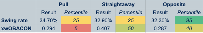 And despite his affinity for heart region pitches, he didn’t really fare much better on those swings. His .355 wOBA and .369 xwOBA on heart pitches ranked near the 20th percentile. Only 37.8% were hard hit (15th percentile).