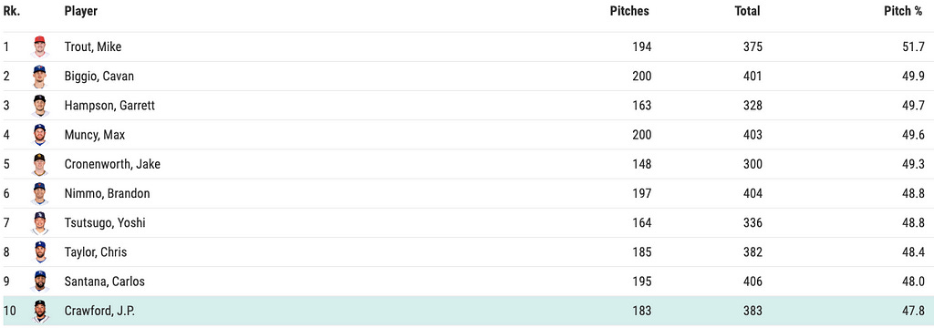 The pitches Crawford takes are also interesting. His swing rate in 2020 was just 41% (20th percentile):
